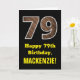 This fun, rustic birthday-themed greeting card design features a large number "79" with a faux wood grain inspired style pattern on the front. The front also features the birthday greeting message "Happy 79th Birthday,", and a personalized recipient name. The inside features a customized birthday greeting message, or could perhaps be cleared and left blank if a message is to be written by hand instead. A custom birthday card like this might be a fun way to send birthday wishes to somebody who is celebrating their seventy ninth birthday. [~Z0000433]
