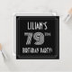 The front of this stylish and 1920s-1930s style inspired seventy-ninth birthday party/celebration invitation card design features an editable name, a fancy art deco style inspired number “79th”, the message “BIRTHDAY PARTY!”, and a border pattern consisting of lines. The background of the front is colored black by default, but it can be customized to a different color if desired. The back features personalized details about the event, such as the date, time, venue, and any other information that may be important. Elegant, luxurious, customizable invitations like these might be used to invite guests to a birthday gathering being held to honor somebody’s 79th birthday. [~Z0000615]