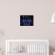 A 7 tables wedding seating chart for a celestial wedding theme, with the moon and star on a starry night blue background. The table numbers are written in big silvery gray stars. The moon, the stars and the word Welcome (written in an elegant calligraphic script) are silvery gray, the rest of the text is white.