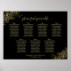 This beautiful wedding seating chart includes seating for 7 tables or 70 guests with 10 seats per table. The chic sophisticated design is simple yet elegant with gold text on a black background. The title reads: "please find your table" in a lacy script calligraphy and the corners are decorated with gold faux foil frills in a delicate floral pattern. Wonderful way to help your guests find their tables at your reception while adding a touch of style.
