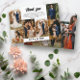 Wedding thank you card you can personalize with seven of your own romantic wedding photos, six on one side and a large one on the other. Thank you is written in a trendy retro script in black against a white background. Add your names and a personal thank you note (or delete it to write something by hand). Photo collage wedding thank you card printed with your favorite wedding photos in an asymmetrical collage surrounding thank you, your names, and a short printed thank you note.