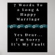 Featuring a delightful design our Funny Wedding Poster is sure to capture everyone's attention. The poster showcases seven words of humorous advice for a long and happy marriage: "Yes Dear, I'm Sorry, It's My Fault." These words serve as a lighthearted reminder of the importance of communication, understanding, and a good sense of humor in a relationship.