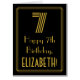 The front of this Roaring Twenties inspired birthday-themed greeting card design features a large art deco look inspired number “7”, the message “Happy 7th Birthday,”, a personalized recipient name, and a border pattern consisting of lines. There is a black-colored background on the front. The inside features an editable birthday greeting message, or could perhaps be cleared and left blank if a message is to be written by hand instead. A custom birthday card like this might be a fun way to send birthday wishes to somebody who is celebrating their seventh birthday. [~Z0000529]