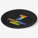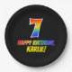 This fun, colorful, and cheerful birthday paper plate design features a large number "7" and the message "HAPPY BIRTHDAY,", both colored with a rainbow spectrum gradient inspired pattern, along with a bold yellow custom name. It has a black colored background. Fun, personalized paper plates like this might be used at a celebration being held to honor somebody’s seventh birthday. [~Z0000488]