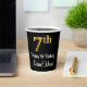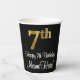 This sophisticated, elegant, and luxurious birthday themed paper cup design features a large ordinal number “7th” having a faux/imitation gold-like look, along with the birthday greeting message “Happy 7th Birthday,” and a custom name in a script-style font. The background is colored black. Birthday themed paper cups like this might be a fun way to celebrate somebody’s 7th birthday. [~Z0000538]
