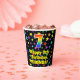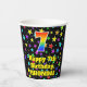 This exciting and colorful birthday paper cup design features a large number “7” with a rainbow spectrum gradient inspired pattern, along with the message “Happy 7th Birthday,”, and a customizable name. The background features a multicolored pattern featuring many star shapes with different colors and sizes. Vibrant, colorful paper cups like this might be fun to have at a birthday celebration/party being held to honor somebody’s 7th birthday. [~Z0000540]