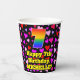 This joyful and fun birthday themed paper cup design features a large number “7” having a rainbow spectrum gradient inspired pattern. It also features the message “Happy 7th Birthday,”, and a personalized name. The background features a pattern of purple, red, and pink heart shapes. Cheerful, fun paper cups like this might be fun to use at a birthday party being held in celebration of somebody’s 7th birthday. [~Z0000548]