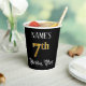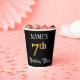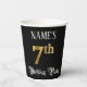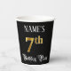 This fancy and opulent birthday paper cup design features an editable name and the message “7th Birthday Party”. The large number “7th” has a faux/imitation gold-inspired coloring pattern, the words “Birthday Party” are in ornate script-style text, and the background is colored black by default (although it can be customized). Elegant, ornate paper cups like this might be useful to have at a birthday celebration being held to celebrate somebody’s seventh birthday. [~Z0000567]
