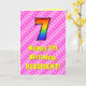 The front of this upbeat and festive 7th birthday-themed greeting card design features a large number "7" having a colorful pattern inspired by the look of a rainbow spectrum. It also features the message "Happy 7th Birthday,", and a customizable recipient name. The background of the front features a cheerful pattern of light pink and dark pink stripes containing loving pink heart shapes. The inside features a customized birthday greeting message, or could perhaps be cleared and left blank if a message is to be written by hand instead. A personalized birthday card like this might be a fun way to acknowledge somebody’s seventh birthday. [~Z0000416]