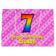 This festive and cheerful 7th birthday themed gift bag design features a large number "7" having a pattern inspired by the appearance of a rainbow spectrum. It also features the message "Happy 7th Birthday,", followed by a customizable name. The background features a fun pattern of light pink and dark pink stripes containing loving pink heart shapes. A gift bag like this might be used when wrapping presents or gifts being given in honor of somebody’s seventh birthday. [~Z0000414]