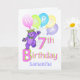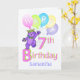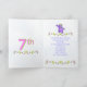 A purple teddy bear princess dressed up in a lovely yellow jeweled crown and pink, blue and green flowers is dancing on the Birthday B and holding a bunch of colorful balloons with the word HAPPY on them. This happy birthday card will bring a smile to a special girl on her 7th birthday. Personalize with her name on card front and inside verse to make it extra special. Original design by Anura Design Studio.