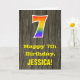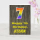 The front of this colorful yet rustic birthday greeting card design features a large number "7" having a rainbow spectrum gradient inspired pattern. It also features the message "Happy 7th Birthday,", and a personalized recipient name. The background of the front of the card features a rustic faux wood grain appearance pattern. The inside features a customized birthday greeting message, or could perhaps be cleared and left blank if a message is to be written by hand instead. A personalized birthday card like this might be a fun way to send a message in celebration of somebody’s seventh birthday. [~Z0000419]