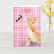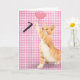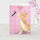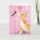 Gold tabby cat with pink heart balloon for 7th birthday on pink and white gingham background.
