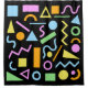 1980s style pattern in colorful shapes of green, yellow, blue and yellow on a black background.