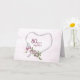 Pink flowers with green ivy bouquet on white satin ribbon heart on pink textured background for 80th wedding anniversary for couple.