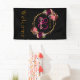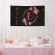 A banner for a 80th birthday party. A chic black background with a faux gold geometric frame. Decorated with dark purple and burgundy flowers, roses and boho style feathers. Templates for a name, age and a date. Date of birth or the date of the party. The name is written with a hand lettered style script, pink colored letters, age 80 in purple and the date with golden numbers. The text: Welcome