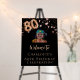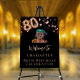 A welcome board for a girly and glamorous 80th birthday party. A classic black background decorated with rose gold stars. Personalize and add a photo and name. Number 80 is written with a balloon style font.