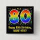 This fun, colorful, and vibrant birthday themed button design features a large number "80" having a rainbow spectrum gradient inspired pattern. It also features the message "Happy 80th Birthday,", and an editable name. Part of the background has a colorful music notes and symbols pattern. Fun, personalized birthday themed buttons like this might be worn by the attendees at a birthday celebration being held to celebrate a musician’s, a song composer’s, a singer’s, or somebody else’s 80th birthday. [~Z0000424]