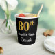This luxurious, stylish, and sophisticated birthday paper cup design features a large ordinal number “80th” having an imitation/faux gold-inspired appearance, plus the birthday greeting message “Happy 80th Birthday,” and a custom name in a script-style font. It also has a black-colored background. Paper cups like this might be use at a party for somebody who is celebrating their 80th birthday. [~Z0000538]