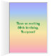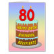This joyful and cheerful birthday themed greeting card design features a cartoon-style depiction of a three-tier birthday cake having number-shaped candles on top showing the age “80“, along with the message “HAPPY 80TH BIRTHDAY,”, and an editable recipient name. The background of the front features a multi-color pastel rainbow spectrum inspired gradient pattern. The inside features a custom birthday greeting message, or could perhaps be cleared and left blank if a message is to be written by hand instead. A colorful, personalized birthday greeting card like this might be used to acknowledge somebody’s eightieth birthday. [~Z0000626]