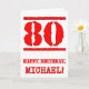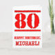 This fun birthday themed greeting card design features a large red number “80” having a rubber stamp inspired appearance, along with the birthday greeting message “HAPPY BIRTHDAY,” and a custom name on the front. The inside has a customizable birthday greeting message, or could perhaps be cleared and left blank if a message is to be written by hand instead. A fun editable birthday greeting card like this might be used to celebrate somebody’s eightieth birthday. [~Z0000524]