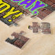 This fun birthday-themed puzzle design features the message “HAPPY 80TH BIRTHDAY,” having a vibrant, colorful, graffiti-inspired look, along with a custom recipient name. The background features a pattern inspired by the look of a brick wall. A fun, customized birthday puzzle like this might be given in celebration of somebody’s eightieth birthday. [~Z0000532]