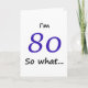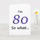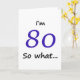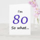 A greeting card for someone celebrating 80th birthday. It comes with a funny quote I`m 80 so what, and is perfect for a person with a sense of humor.