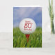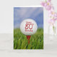 Close up of a white golf ball on a red tee in grass with sky background for 80th birthday.