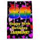 This cheerful and joyful birthday gift bag design features a large number “80” with a rainbow spectrum gradient inspired pattern, along with the message “Happy 80th Birthday,”, and a custom name. The background features a pattern of heart shapes with colors like red, pink, and purple. A giftbag like this might be a fun way of wrapping a birthday present or gift being given to somebody who is celebrating their eightieth birthday. [~Z0000551]