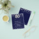 A modern, stylish and glamorous invitation for a 80th birthday party. A navy blue background, decorated with faux silver stars. Personalize and add your name and party details. Number 80 is written with a balloon style font.