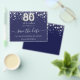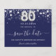 A trendy Save the Date for a 80th birthday party. A navy blue colored background. Decorated with faux silver stars. The text: Save the Date is written with a large trendy hand lettered style script. Number 80 is written with a balloon style font.