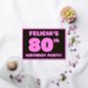 The front of this bold and fun eightieth birthday celebration/party foil announcement card features an editable name, a large number “80th”, the message “BIRTHDAY PARTY!”, and a border, all featuring a girly dark pink and light pink lines pattern. The back features personalized details about the event, such as the date, time, place/venue, and any other important information. Customizable invitations like these might be used to invite attendees to a birthday gathering being held to honor somebody’s 80th birthday. [~Z0000597]