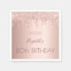 A napkin for a girly and glamorous 80th birthday party. A rose gold background with an elegant faux rose gold drips, paint drip look. The text: The name is written in dark rose gold with a large modern hand lettered style script. Template for name, age 80 and a date.