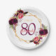 A plate for a 80th birthday party. A chic white background with a faux gold geometric frame. Decorated with dark purple and burgundy flowers, roses and boho style feathers. Templates for a name, age 80 and a date. Date of birth or the date of the party. The name is written with a hand lettered style script, pink colored letters, age in purple and the date with golden numbers.