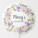 Very pretty purple rose floral wreath surrounds the birthday celebrant's name and birthday. The purple roses are nestled in soft sage green eucalyptus leaves. The celebrant's name is written in a feminine script to make it very special.