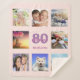 A gift for a woman's 80th birthday, celebrating her life with a collage of 8 of your photos of her friends, family, interest or pets. Personalize and add her name, age 80 and a date. Date of birth or the date of the birthday party. Pink and purple colored letters. Girly and trendy rose gold, blush pink background color.