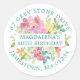Add a special touch to your birthday invitation envelopes with this elegant round design. It features a summer watercolor floral in the center. Blue eucalyptus leaves give it a rustic botanical vibe. The name and birthday is written across the center on a white strip, and the address is added in curved text above and below the watercolor floral.