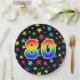 This colorful, cheerful, and fun paper plate design features a large number "80" colored with a rainbow spectrum gradient inspired pattern. The background features a pattern of colorful star shapes. Fun paper plates like this might be used at a celebration being held to observe somebody’s eightieth birthday, or a couple’s eightieth anniversary, or some other 80th event. [~Z0000493]