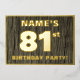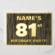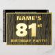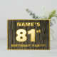 The front of this bold eighty-first birthday celebration foil invitation card features a personalized name, a large number “81st”, the message “BIRTHDAY PARTY!”, and a border, all in foil. There is a rustic, yet elegant, faux wood grain appearance inspired pattern for the background of the front. The back features personalized details about the event, such as the date, time, venue, and any other relevant information. Customizable invitations like these might be used to invite attendees/guests to a birthday gathering/party being held to honor somebody’s 81st birthday. [~Z0000598]