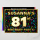 The front of this vibrant and joyful eighty-first birthday party/celebration foil invitation card design features an editable name, a large number “81st”, the message “BIRTHDAY PARTY!”, and a border. The background of the front has an eye-catching, multicolored pattern of musical symbols. The back features personalized details about the event, such as the date, time, venue/location, and any other useful information. Customizable invitations like these might be a fun way to invite attendees/guests to a birthday gathering being held in celebration of somebody’s 81st birthday. These might be more meaningful if that person is a songwriter, a singer, a musician, a composer, or likes listening to music. [~Z0000601]