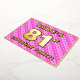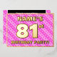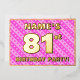 The front of this joyful and fun eighty-first birthday celebration/party foil invitation card design features an editable name, a large number “81st”, the message “BIRTHDAY PARTY!”, and a border. The background of the front has an upbeat dark pink and light pink striped pattern, with heart shapes. The back features personalized details about the event, such as the date, time, place, and any other information that may be important. Customizable invitations like these might be a fun way to invite attendees to a birthday party being held to celebrate somebody’s 81st birthday. [~Z0000603]