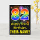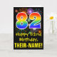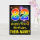 The front of this fun, colorful, and exciting birthday-themed greeting card design features a large number "82" with a rainbow spectrum gradient inspired pattern, along with the message "Happy 82nd Birthday,", and a custom recipient name. The front additionally features a colorful background pattern inspired by the look of bursting celebratory fireworks. The inside features a customizable birthday greeting message, or could perhaps be cleared and left blank if a message is to be written by hand instead. A customizable birthday card like this might be a fun way to acknowledge somebody’s eighty second birthday. [~Z0000442]