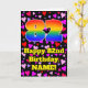 The front of this fun and colorful birthday-themed greeting card design features a large number “82” with a rainbow spectrum gradient inspired pattern, along with the message “Happy 82nd Birthday,”, and a customizable name. The background of the front features a pattern of pink, red, and purple heart shapes. The inside has a personalized birthday greeting message, or could perhaps be cleared and left blank if a message is to be written by hand instead. A fun, customizable birthday greeting card like this might be used to celebrate somebody’s eighty-second birthday. [~Z0000551]