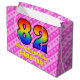 This upbeat and happy 82nd birthday-themed gift bag design features a large number "82" having a rainbow spectrum inspired gradient pattern. It also features the message "Happy 82nd Birthday,", followed by a customizable name. The background features a dark pink and light pink stripes pattern containing loving pink heart shapes. Gift bags like this might be used when wrapping gifts or presents being given to somebody who is celebrating their eighty second birthday. [~Z0000414]