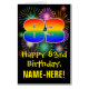 The front of this fun, colorful, and cheerful birthday greeting card design features a large number “83” with a rainbow spectrum gradient inspired pattern, along with the message “Happy 83rd Birthday,”, and an editable recipient name. The front additionally has a multicolored background pattern inspired by bursting celebratory fireworks. The inside features a personalized birthday greeting message, or could perhaps be cleared and left blank if a message is to be written by hand instead. A personalized birthday card like this might be a fun way to send a message celebrating somebody’s eighty third birthday. [~Z0000526]