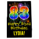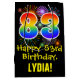 This exciting, fun, and colorful birthday gift bag design features a large number "83" with a rainbow spectrum gradient inspired pattern, along with the message "Happy 83rd Birthday,", and an editable recipient name. It also features a colorful background pattern inspired by the appearance of bursting celebratory fireworks. A gift-bag like this might be used when giving a gift or present in honor of somebody’s 83rd birthday. [~Z0000509]