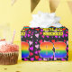 This happy and colorful birthday wrapping paper design features a large number “83” with a rainbow spectrum gradient inspired pattern, along with the message “Happy 83rd Birthday,”, and a customizable name. The background features a pattern of heart shapes with colors like purple, red, and pink. Birthday themed wrapping paper like this might be used when giving a gift or present in celebration of somebody’s eighty third birthday. [~Z0000549]