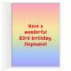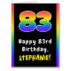 This fun and bold birthday-themed greeting card design features the number “83“ with a multicolored rainbow spectrum inspired gradient pattern, along with the message “Happy 83rd Birthday,”, and a personalized recipient name. The inside has a personalized birthday greeting message, or could perhaps be cleared and left blank if a message is to be written by hand instead. An upbeat, customized birthday greeting card like this might be used to acknowledge somebody’s eighty-third birthday. [~Z0000628]