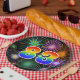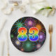 This cheerful, colorful, and fun paper plate design features a large number "83" containing a rainbow spectrum gradient inspired pattern coloring. It also features a vibrant and exciting bursting celebratory fireworks inspired pattern. The background is colored black. Paper plates like this might be fun to use at a party being held to celebrate somebody’s 83rd birthday, an 83rd anniversary, or some other 83rd event. [~Z0000490]