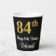 This stylish, luxurious, and sophisticated birthday-themed paper cup design features a large ordinal number “84th” having a faux/imitation gold-inspired appearance, along with the birthday greeting message “Happy 84th Birthday,” and an editable name in a script-style font. It also has a black-colored background. Elegant birthday themed paper cups like this might be used at a party celebrating somebody’s eighty fourth birthday. [~Z0000538]